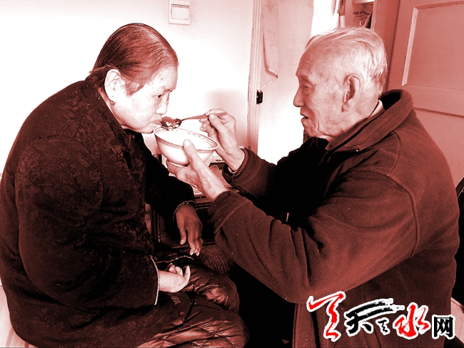 ????李老當(dāng)時(shí)是天水新華印刷廠的優(yōu)秀員工,因踏實(shí)肯干、工作認(rèn)真,正得到廠里的重用。自妻子癱瘓后,他就單位家里兩頭跑,最后,為了能好好照顧妻子,他放棄提干的機(jī)會(huì)提前退休,全職在家照顧妻子,從做飯、洗衣等家務(wù)一樣樣地學(xué)起,那年他才50多歲。喂飯、換衣、擦身、洗尿布、按摩、煎藥、翻身、梳頭……妻子癱瘓31年來(lái),身上從沒(méi)有生過(guò)瘡。