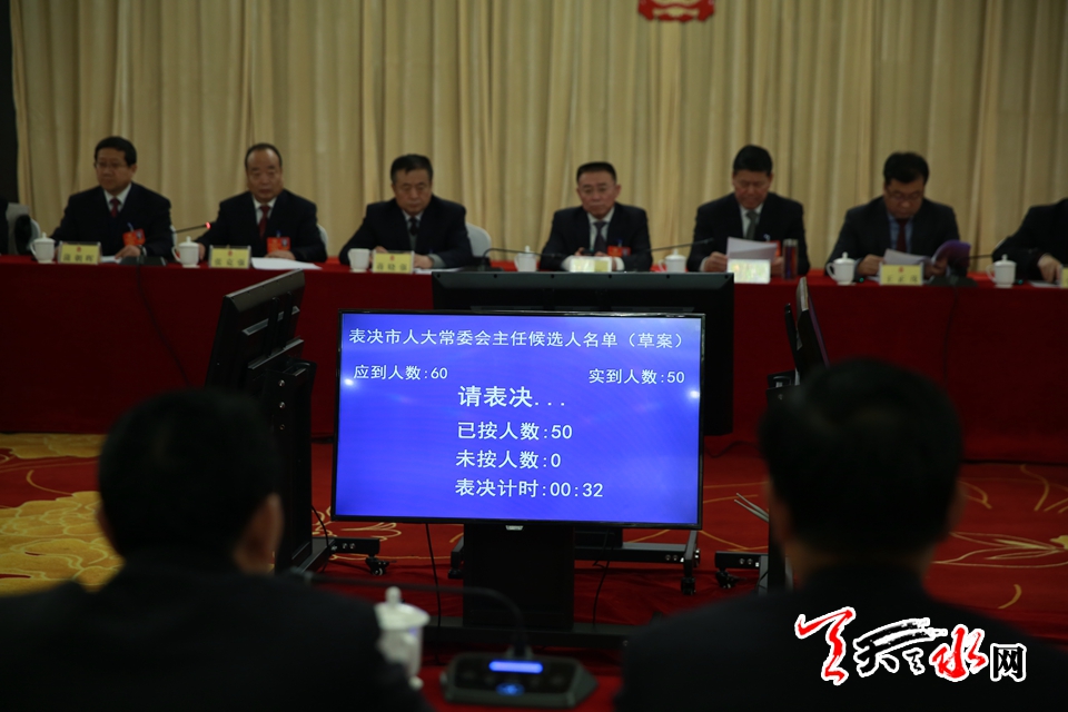 會議表決了天水市第七屆人民代表大會常務(wù)委員會關(guān)于接受王光慶等辭去職務(wù)請求的決定(草案);會議聽取了主席團提名的各項候選人情況匯報;通過了主席團提名的各項候選人名單(草案);通過了代表聯(lián)合提名候選人截止時間的決定(草案)(1月8日16時30分);會議還通過了計票人名單(草案)。