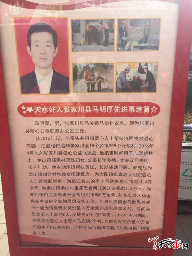 “馬明厚,男,張家川縣馬關(guān)鎮(zhèn)馬堡村農(nóng)民,現(xiàn)為張家川縣愛心公益聯(lián)盟辦公室主任。從2015年起,他帶頭并組織愛心人士幫扶濟困發(fā)放愛心衣物,把溫暖傳遞到張家川縣15個鄉(xiāng)鎮(zhèn)255個行政村……”一個男聲用普通話念著,抑揚頓挫,像在朗誦。