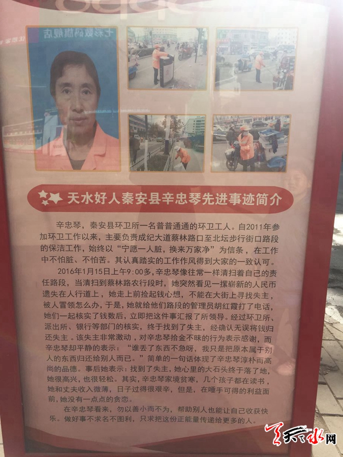 “這個是秦安的,我的老鄉(xiāng),親切啊?!币晃话⒁陶驹诹硪恍麄髋魄埃们匕苍捘畹?,“辛忠琴,秦安縣環(huán)衛(wèi)所一名普普通通的環(huán)衛(wèi)工人,自2011年參加環(huán)衛(wèi)工作以來,主要負(fù)責(zé)成紀(jì)大道蔡林路口到北壇步行街口路段的保潔工作……”