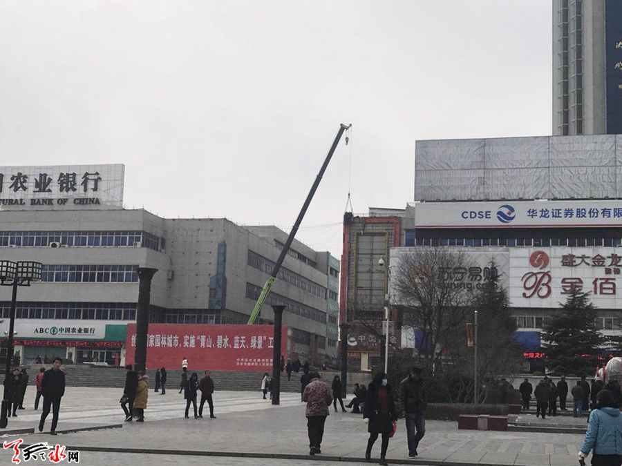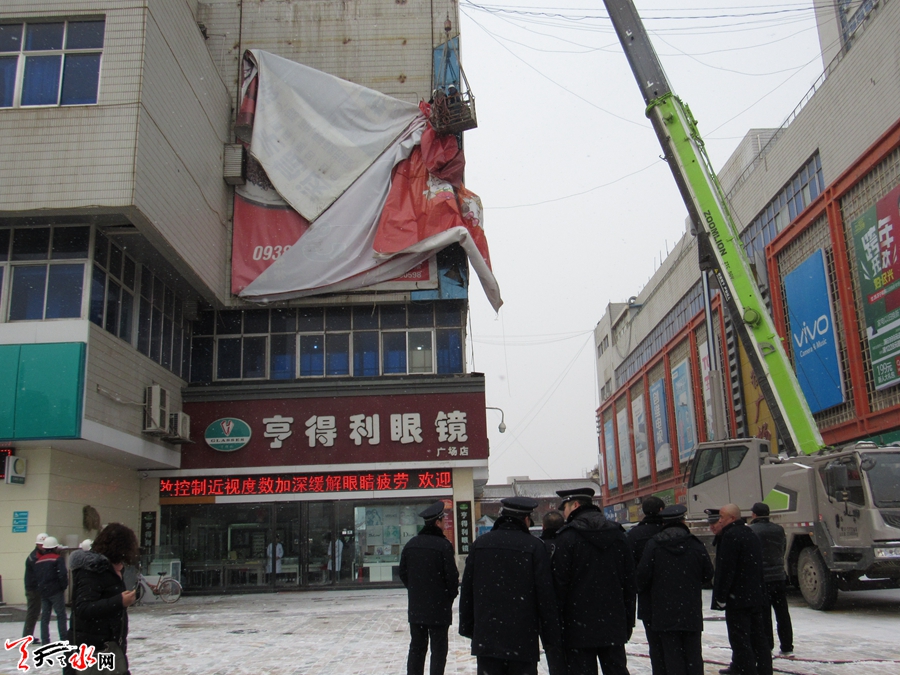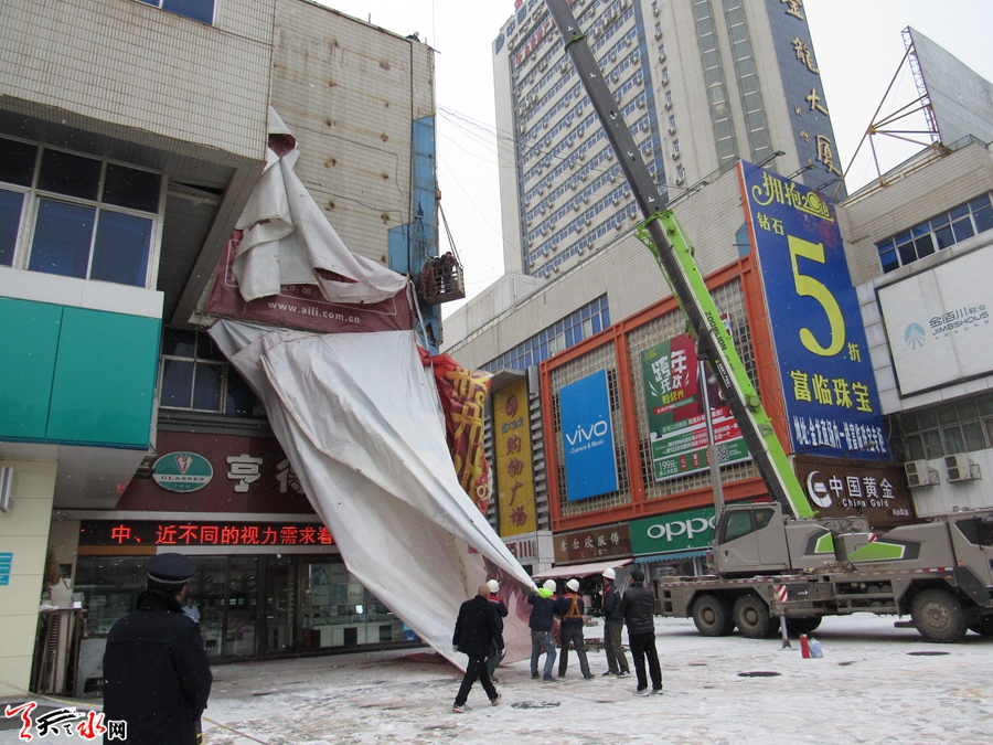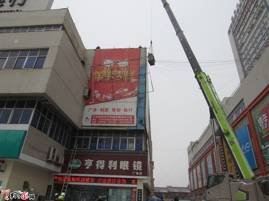 ????為了保證拆除工作順利進行,秦州區(qū)執(zhí)法局在拆除前通過走訪調(diào)查、查詢審批手續(xù)和下發(fā)相關(guān)法律文書等方式告知產(chǎn)權(quán)人限期拆除。1月30日上午,秦州區(qū)執(zhí)法局組織30名執(zhí)法人員、雇用專業(yè)拆遷公司工人20人和大型吊車一輛,利用電焊槍、切割機等設(shè)備對龍城廣場昊泰和金龍樓體廣告牌進行拆除,截止30日下午共拆除大型商業(yè)廣告牌4塊,約500余平方米,本次整治行動還在持續(xù)進行中。