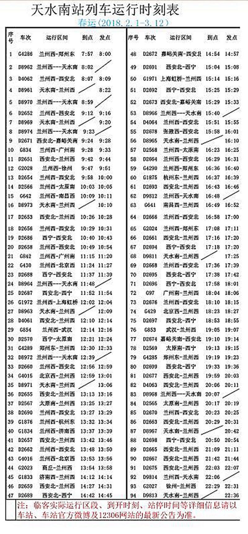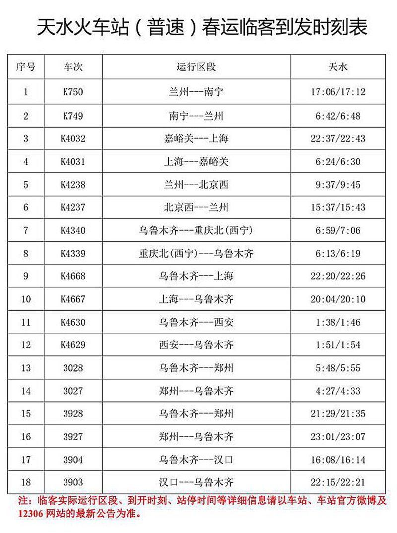 2月1日,為期40天的2018年春運(yùn)工作全面啟動(dòng),在通過(guò)走訪天水南站、天水機(jī)場(chǎng)、天水火車(chē)站、天嘉交運(yùn)集團(tuán)天水汽車(chē)站后,記者了解到,針對(duì)今年春運(yùn)工作,鐵路、公路、機(jī)場(chǎng)等部門(mén)已做好各項(xiàng)春運(yùn)前的準(zhǔn)備工作,多措并舉,全力以赴備戰(zhàn)2018年春運(yùn)。