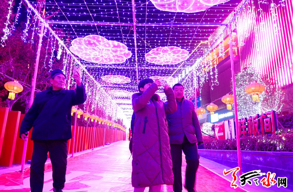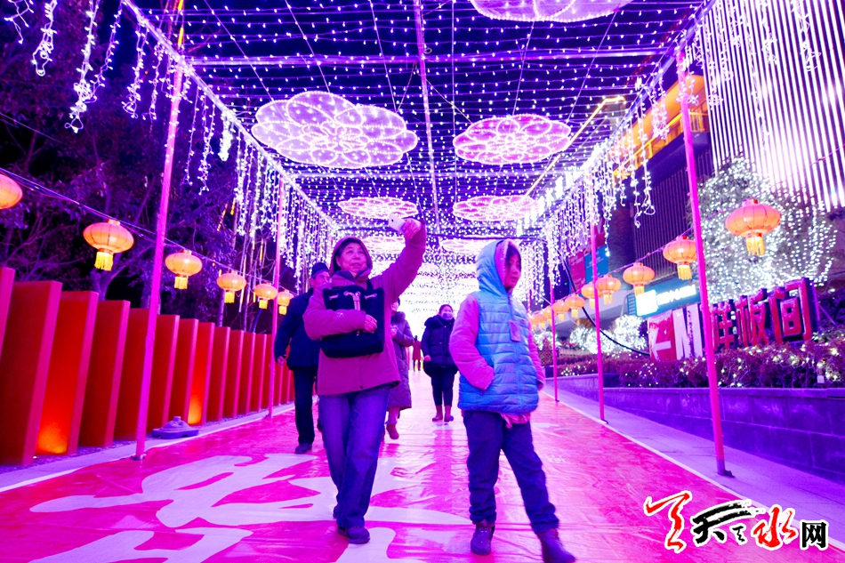 此次燈展分為民俗類、時尚年輕類、兒童互動類,有狗年大吉、碩果累累、十二生肖等獨具創(chuàng)意的燈組54組,給天水市民帶來年味十足的視覺盛宴。全媒體記者李旺旺 攝