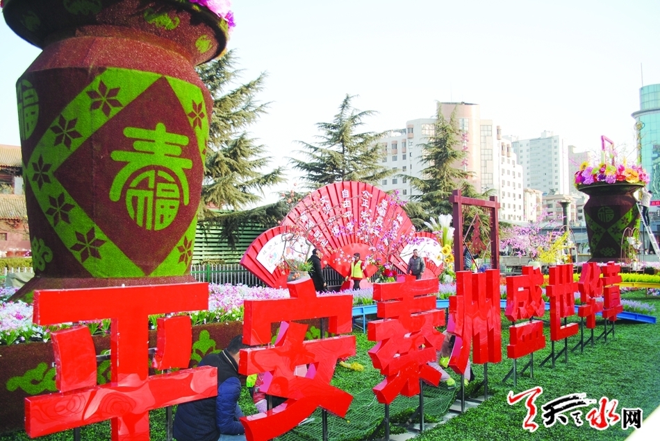2月10日,在秦州區(qū)龍城廣場,秦州區(qū)園林處施工人員正在抓緊作業(yè),布置主題為“平安秦州、盛世華章”的花壇。