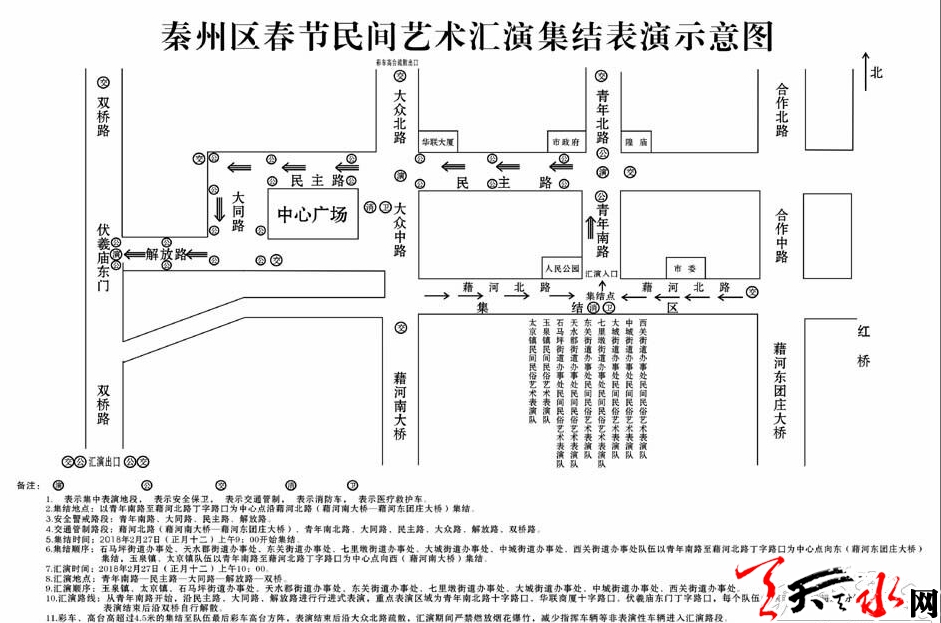 匯演地點(diǎn):青年南路南端丁字路口(集結(jié)點(diǎn))—青年南北路十字(第一匯演點(diǎn))—龍城廣場(chǎng)十字(第二匯演點(diǎn))—伏羲廟東門(mén)口(第三匯演點(diǎn))