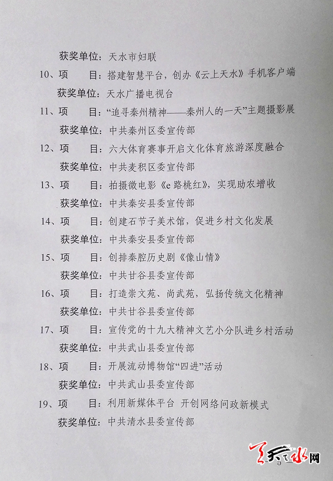 ▲麥積區(qū)、秦州區(qū)、張家川縣榮獲2017年度全市宣傳思想工作先進(jìn)縣區(qū)。