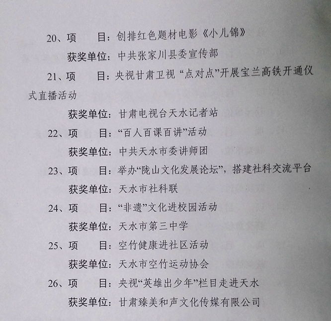 ▲甘谷縣、秦安縣、天水日報社、市總工會、市婦聯(lián)、甘肅臻美和聲文化傳媒有限公司等單位榮獲2017年度全市宣傳思想文化工作特色創(chuàng)新獎。