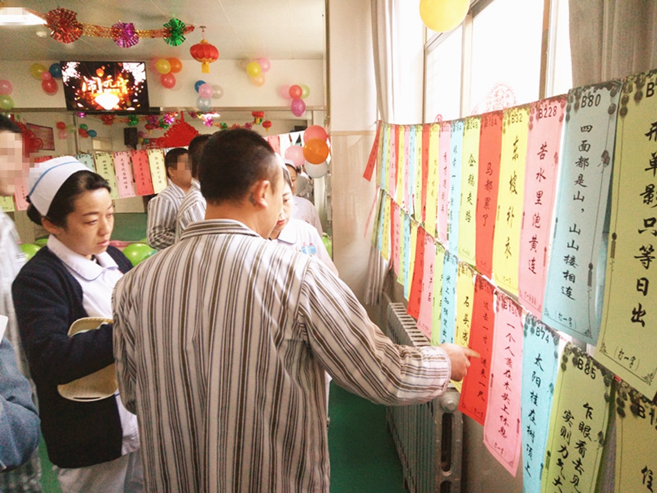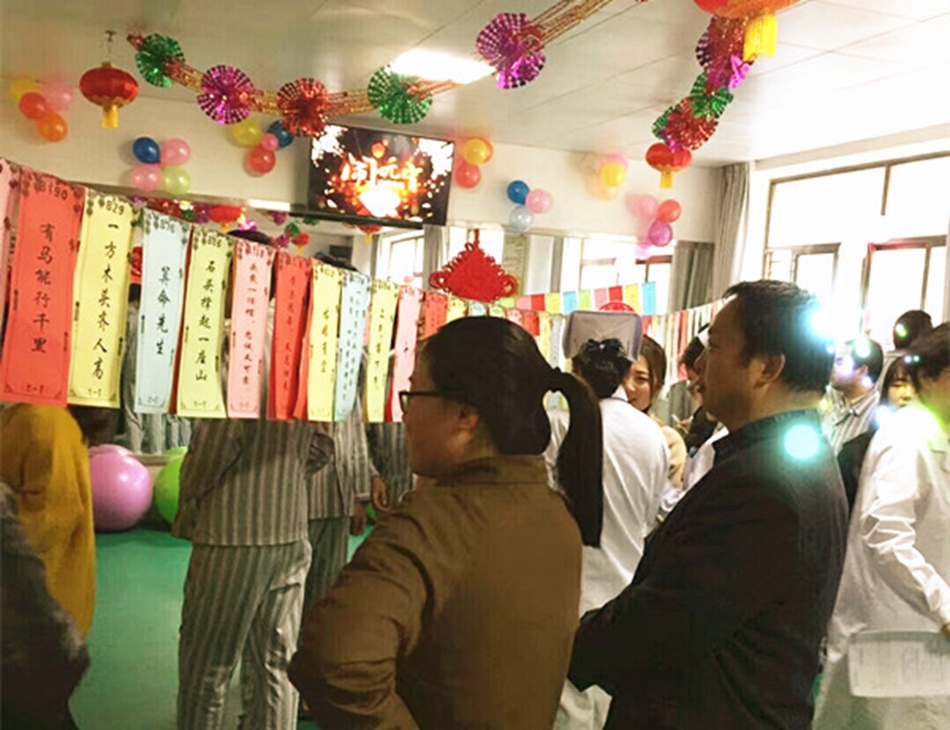 ????2月28日下午15時(shí),藝術(shù)行為治療中心到處張燈結(jié)彩,熱鬧非凡,一盞盞高高懸掛的大紅燈籠,一條條妙趣橫生的五彩燈謎,無(wú)一不彰顯節(jié)日的喜慶,成為了我院春節(jié)期間的最亮眼的文化大餐。前來(lái)參加燈謎競(jìng)猜的人也是絡(luò)繹不絕,大家都熱情高漲、欲欲躍試。隨著主持人宣布活動(dòng)開(kāi)始,每個(gè)燈謎競(jìng)猜區(qū)域都人頭攢動(dòng),猜謎者有的胸有成竹,一猜即中;有的觀而不語(yǔ),神情專(zhuān)注;有的激烈討論,集思廣益;也有的圍觀助興,開(kāi)懷大笑,整個(gè)活動(dòng)現(xiàn)場(chǎng)氣氛熱烈而融洽。尤為值得一提的是,前來(lái)參加燈謎競(jìng)猜的患者個(gè)個(gè)都積極投入,認(rèn)真思索,負(fù)責(zé)陪同的護(hù)士更是苦思冥想,在旁協(xié)助,他們共同琢磨、相互交流,一同探討謎底,一起分享喜悅,每個(gè)人臉上都洋溢著歡樂(lè)的笑容,很多人都被眼前醫(yī)患共融的場(chǎng)景深深感動(dòng)。