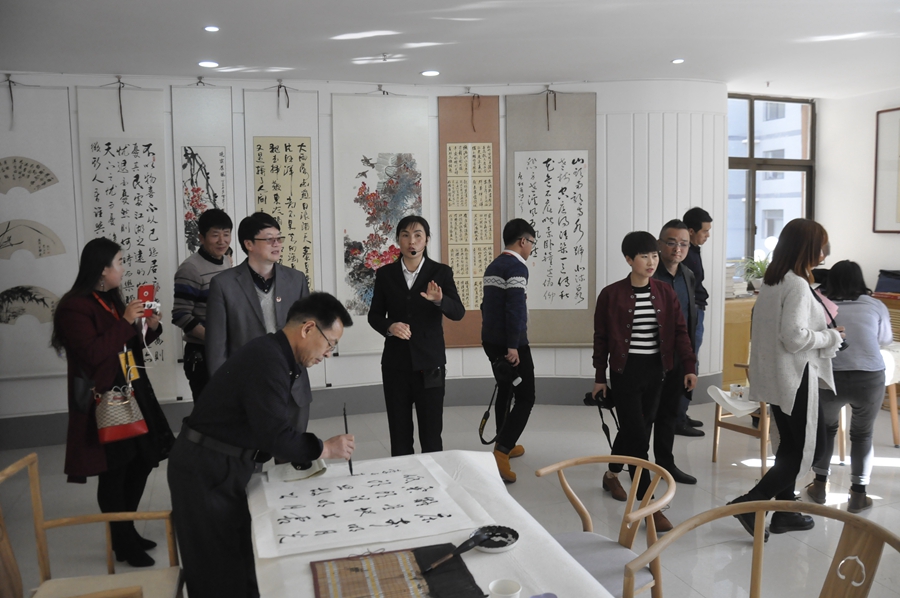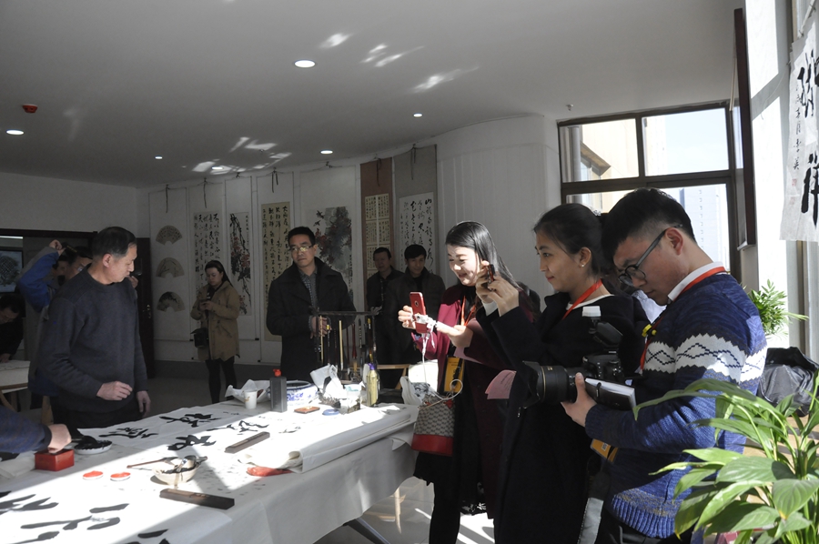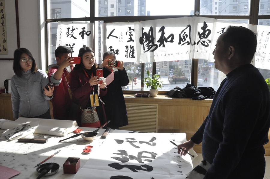 在社區(qū)的藝術(shù)之家,采訪團(tuán)遇到社區(qū)正在進(jìn)行“黨員固定學(xué)習(xí)日”的書畫筆會(huì)活動(dòng),社區(qū)居民在寬敞明亮的活動(dòng)實(shí)力進(jìn)行書畫創(chuàng)作與交流,他們有的揮墨書寫,有的精描細(xì)畫,墨香飄蕩,書畫同彩。居民溫玉中在4尺宣紙上寫下了“祥云瑞氣”四個(gè)大字,他高興的對(duì)記者說,新時(shí)代、新生活、新家園、新氣象都是祥云瑞氣,這四個(gè)字表達(dá)了我們小區(qū)居民對(duì)美好生活的向往。