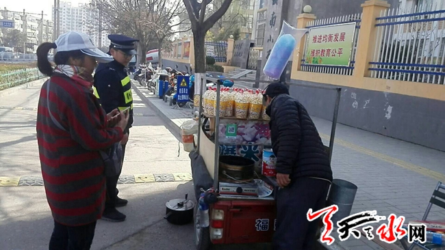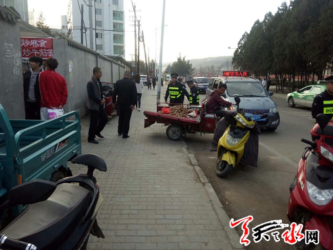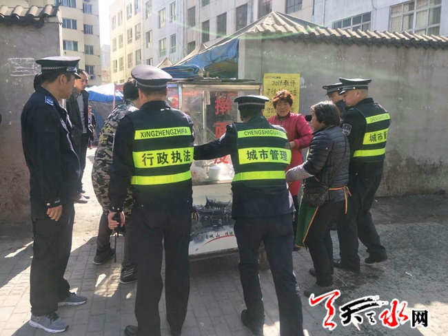 ?天天天水網(wǎng)訊(通訊員 靳雪萍)為了給廣大師生營(yíng)造一個(gè)安全、整潔、舒適的學(xué)習(xí)環(huán)境,在中小學(xué)開(kāi)學(xué)以來(lái),秦州區(qū)執(zhí)法局玉泉中隊(duì)針對(duì)學(xué)校周邊零散攤點(diǎn)增加的情況,中隊(duì)領(lǐng)導(dǎo)開(kāi)會(huì)研究討論,在校園周邊開(kāi)展集中整治行動(dòng),依法對(duì)學(xué)校周邊的流動(dòng)攤販、占道經(jīng)營(yíng)、非機(jī)動(dòng)車亂停亂放等違法行為進(jìn)行整治,消除各類安全隱患。