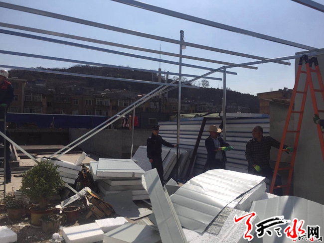 據(jù)了解,秦州區(qū)執(zhí)法局機(jī)動中隊(duì)隊(duì)員在轄區(qū)內(nèi)正常巡查時發(fā)現(xiàn),玉泉鎮(zhèn)東團(tuán)莊村新村周某和李某兩戶正在搭建活動板房,其中,周某搭建的墻體已完工,李某正在焊接鐵皮底座,執(zhí)法隊(duì)員立即詢問當(dāng)事人是否辦理審批手續(xù),同時進(jìn)行了相關(guān)法律法規(guī)的宣傳,并告知其建筑未辦理審批手續(xù)擅自搭建屬違章建筑,需要進(jìn)行拆除,在了解情況后,當(dāng)事人周某答應(yīng)自行拆除;經(jīng)過執(zhí)法隊(duì)員的耐心勸解,當(dāng)事人李某停止了其違章行為,并承諾不再搭建。在執(zhí)法人員的協(xié)助下,經(jīng)過4個多小時的作業(yè),平穩(wěn)的拆除了周某搭建的違章建筑,面積約170平方米。