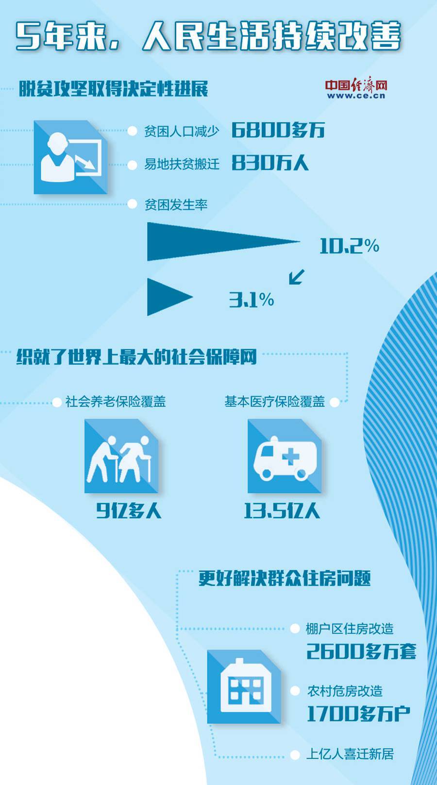 過去5年,我們堅持以人民為中心的發(fā)展思想,著力保障和改善民生,人民群眾獲得感不斷增加。在財力緊張情況下,政府持續(xù)加大民生投入,中央財政5年投入專項扶貧資金2800多億元,財政性教育經費占國內生產總值比例持續(xù)超過4%,居民基本醫(yī)保人均財政補助標準由240元提高到450元,近6000萬低保人員和特困群眾基本生活得到保障……一個個具體的數字,勾勒出一張世界最大的社會保障網,代表委員們也對人民生活持續(xù)改善充滿期待。