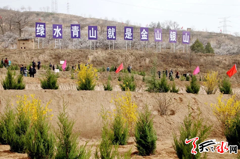 春風(fēng)拂動(dòng),彩旗飄揚(yáng),“綠水青山就是金山銀山”等宣傳標(biāo)語格外醒目,植樹現(xiàn)場(chǎng)一派熱火朝天的勞動(dòng)景象。