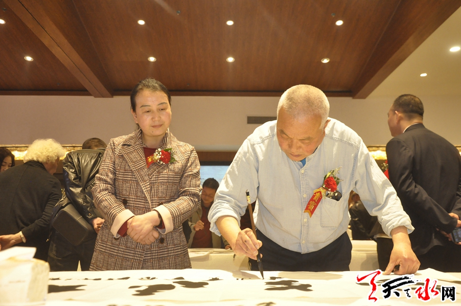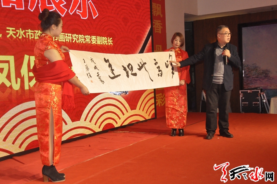 中國(guó)書(shū)法家協(xié)會(huì)會(huì)員、天水市政協(xié)書(shū)畫(huà)研究院常委副院長(zhǎng)王鳳?,F(xiàn)場(chǎng)贈(zèng)送書(shū)法作品并就就書(shū)法的行文規(guī)則及書(shū)法創(chuàng)作布局技巧為與會(huì)人員做了詳細(xì)的講解。