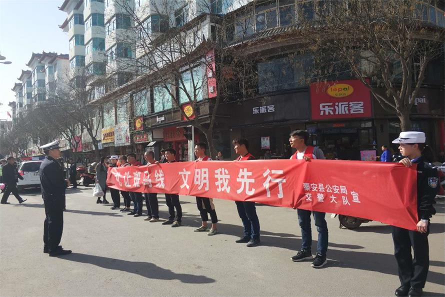 秦安縣公安局交警大隊(duì)在新華街什字開展了以“禮讓斑馬線?文明我先行”為主題的宣傳活動(dòng)。大隊(duì)民警及文明勸導(dǎo)志愿者在新華街十字通過散發(fā)傳單、懸掛宣傳橫幅等多種形式廣泛宣傳,勸導(dǎo)過往的行人、機(jī)動(dòng)車駕駛員、非機(jī)動(dòng)車駕駛員,自覺遵守道路交通法律法規(guī),提醒車輛在斑馬線前注意減速慢行、不搶道、禮讓行人優(yōu)先通過,引導(dǎo)行人走斑馬線、不隨意橫穿馬路、不得翻越護(hù)欄,杜絕不文明交通行為,并通過自己的行動(dòng)去影響和帶動(dòng)身邊的人自覺文明行車、遵守交通法規(guī),使“禮讓斑馬線”成為秦安的一道靚麗風(fēng)景。?