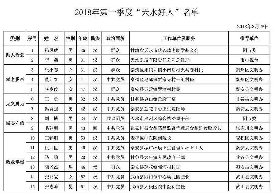 天天天水網(wǎng)訊【記者羅雙紅】日前,2018年第一季度“天水好人”名單正式出爐,楊鳳武、李鑫等15位市民榜上有名。
