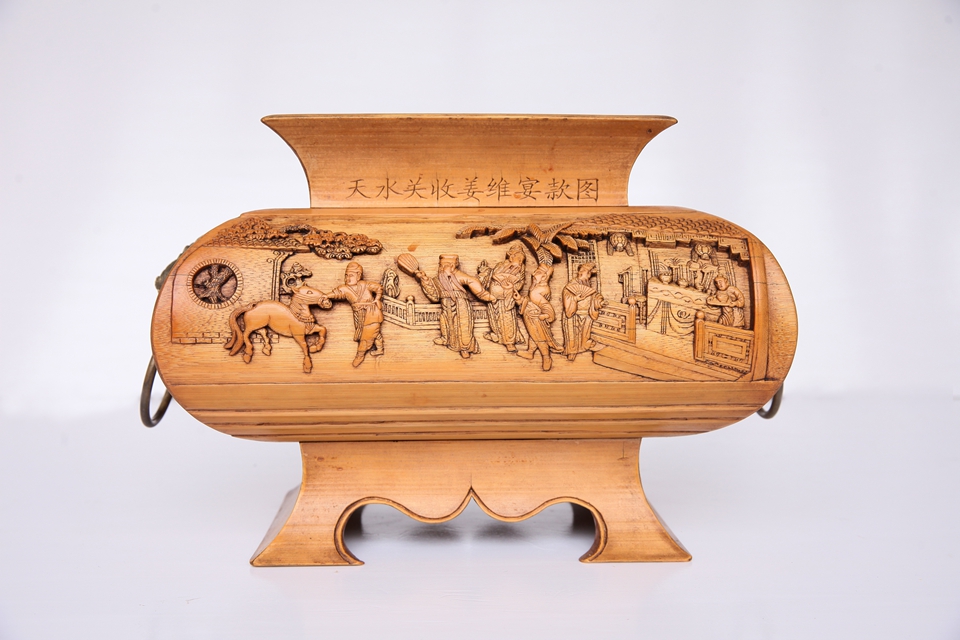 竹雕天水關收姜維宴款圖尊 作者:吳云生申報單位:天水市竹藝文化研究中心