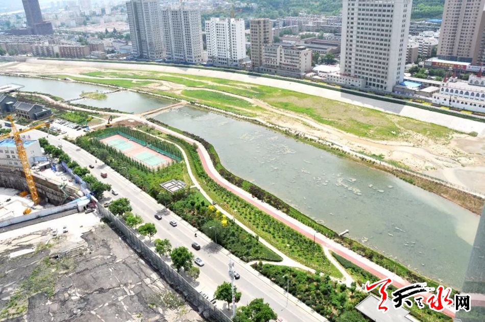 優(yōu)美的綠化景觀、鏡面般延伸的湖水、紅色的透水步道……這是5月15日記者在秦州區(qū)藉河北路建筑科技大廈25樓拍到的藉河生態(tài)綜合治理一期續(xù)建工程部分遠(yuǎn)景俯瞰圖。