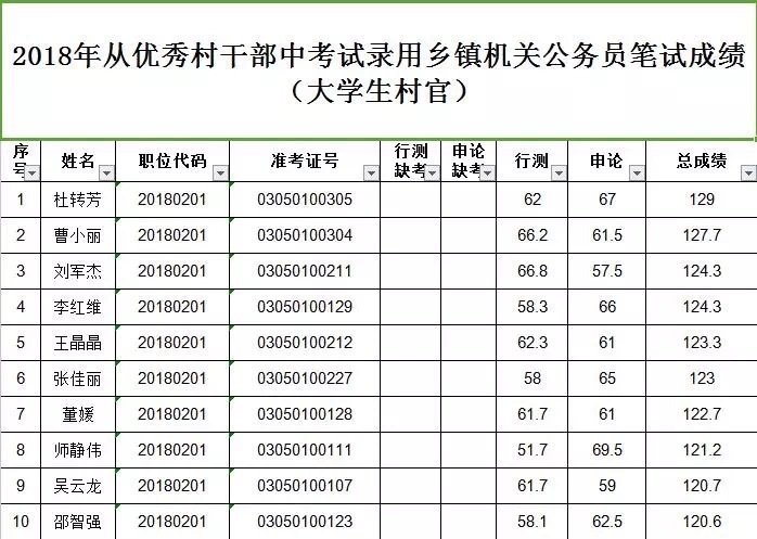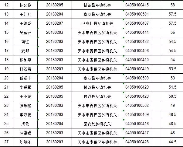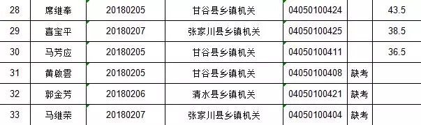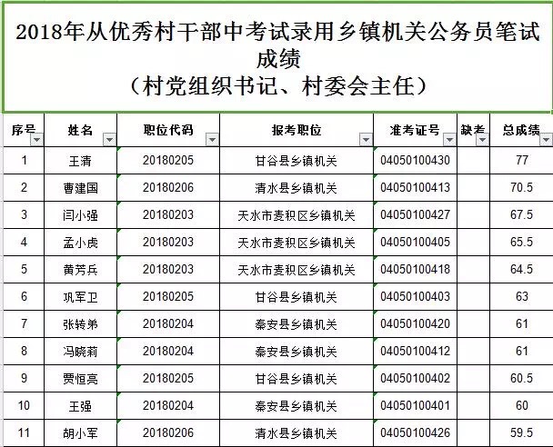 附:1. 天水市2018年從優(yōu)秀村干部中考試錄用鄉(xiāng)鎮(zhèn)機(jī)關(guān)公務(wù)員大學(xué)生村官筆試成績(jī)