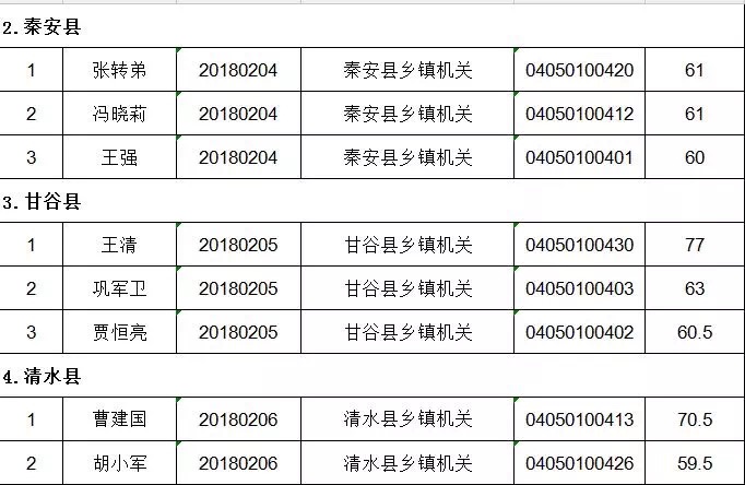 2. 天水市2018年從優(yōu)秀村干部中考試錄用鄉(xiāng)鎮(zhèn)機(jī)關(guān)公務(wù)員村黨組織書(shū)記、村委會(huì)主任筆試成績(jī)