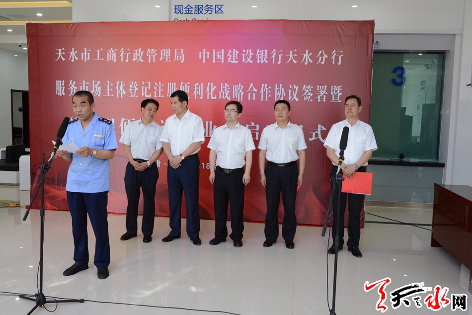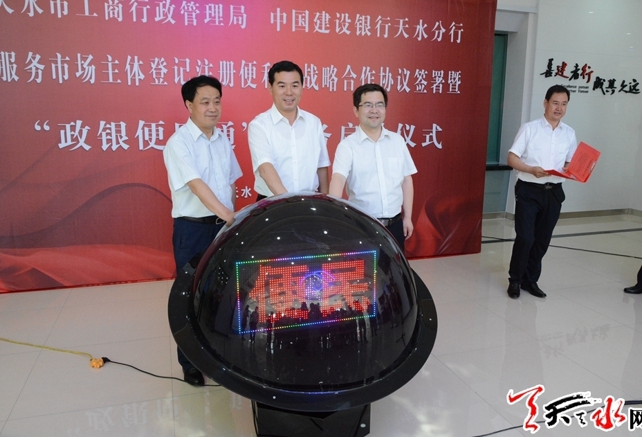 天天天水網(wǎng)訊【記者馬哲】6月14日,天水市工商行政管理局與建設(shè)銀行天水分行簽署了戰(zhàn)略合作協(xié)議,并在建行天水分行營(yíng)業(yè)室啟動(dòng)“政銀便民通”業(yè)務(wù)。副市長(zhǎng)程偉東出席啟動(dòng)儀式,宣布建設(shè)銀行天水分行“政銀便民通”業(yè)務(wù)正式啟動(dòng)。