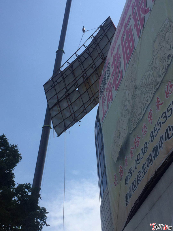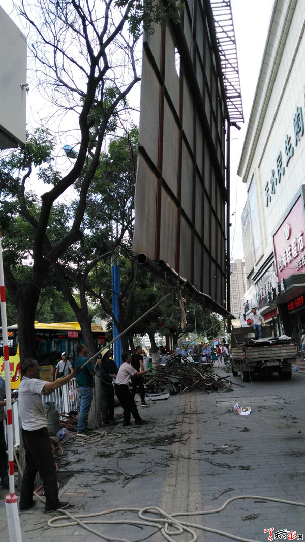 天天天水網(wǎng)訊【通訊員 趙懿】為了喜迎伏羲文化旅游節(jié),優(yōu)化城市環(huán)境,提升城市形象,秦州區(qū)執(zhí)法局按照市委市政府、區(qū)委區(qū)政府統(tǒng)一部署,從6月6日開(kāi)始對(duì)大眾中路天水自來(lái)水公司大樓、蘭天城市廣場(chǎng)、金宇大廈、民生購(gòu)物中心等建筑樓體設(shè)置的未審批、審批已過(guò)期、安全隱患大、改變建筑物外觀、破壞城市形象的各類大型廣告牌進(jìn)行拆除,所有參與拆除行動(dòng)的執(zhí)法人員和施工人員工作兢兢業(yè)業(yè),放棄節(jié)假日,工作加班加點(diǎn),連續(xù)奮戰(zhàn)11天,共拆除大型廣告牌13塊、2500余平方米,截止6月16日晚20時(shí)大眾中路廣告牌拆除行動(dòng)圓滿結(jié)束。