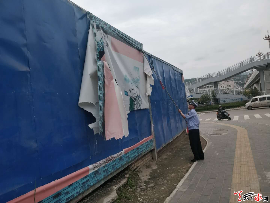 天天天水網(wǎng)訊 節(jié)會舉辦在即,秦州區(qū)執(zhí)法局集中執(zhí)法力量,扎實(shí)開展“凈城治癬”專項(xiàng)行動,以伏羲廟、城市出入口、來賓駐地為點(diǎn),43條主次干道為線,點(diǎn)線結(jié)合,全面細(xì)查排摸,細(xì)化措施,責(zé)任到人,集中整治建(構(gòu))筑物立面、交通護(hù)欄、圍墻及公共設(shè)施上亂涂亂畫、亂掉亂掛、亂搭亂建、店外經(jīng)營、店外作業(yè)及違章行為,高標(biāo)準(zhǔn)打造整潔有序的城市環(huán)境,喜迎第29屆中國?天水伏羲文化旅游節(jié)成功舉辦。