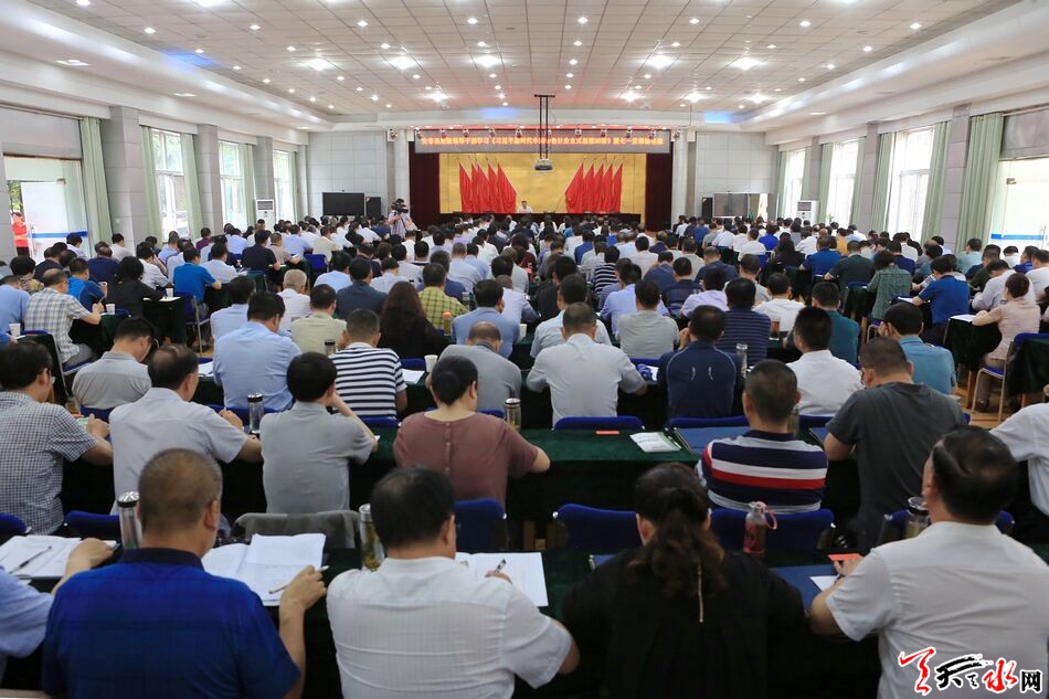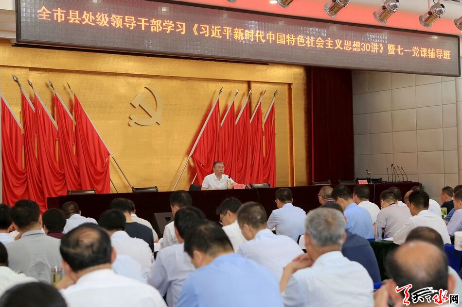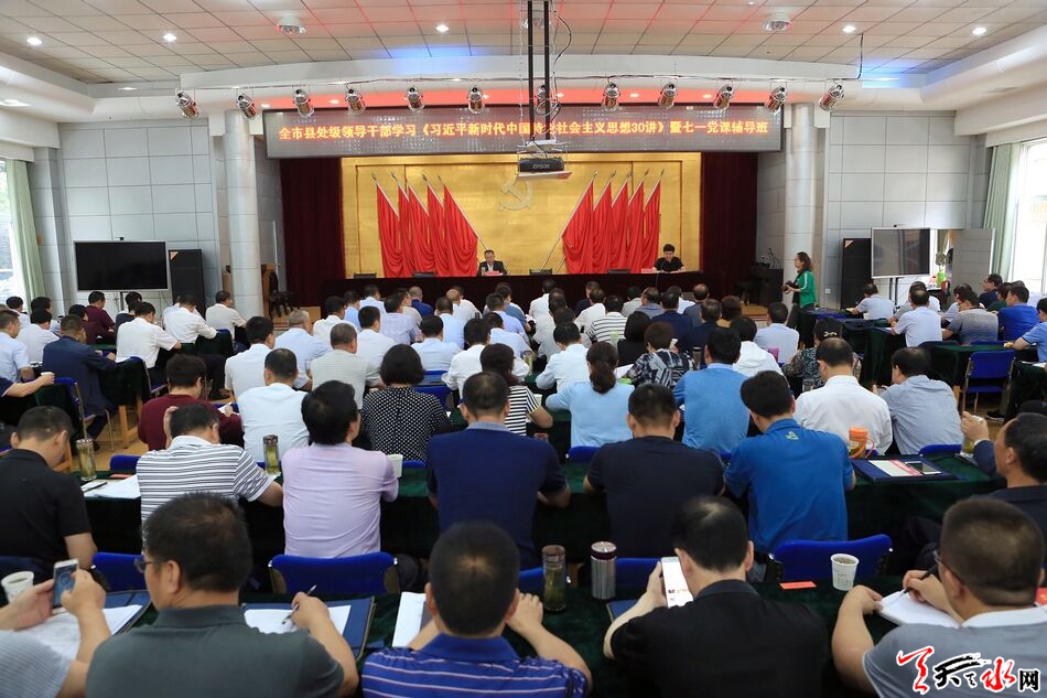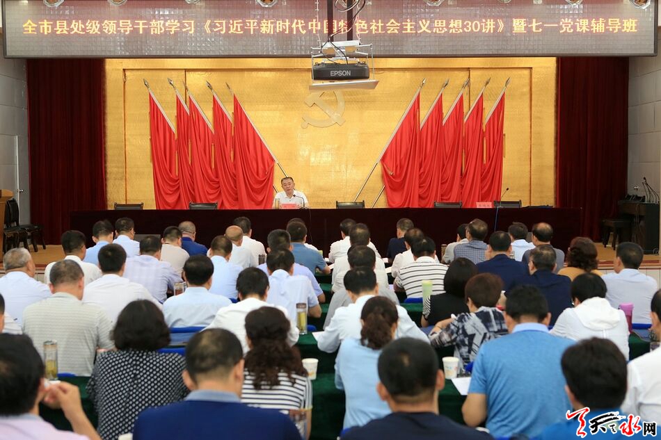 天天天水網(wǎng)訊【全媒體記者王曉馨】6月26日,市委書記王銳為全市縣處級領(lǐng)導干部學習《習近平新時代中國特色社會主義思想30講》暨七一黨課輔導班的學員講黨課。他強調(diào),全市各級黨政組織和廣大黨員領(lǐng)導干部要在鞏固前一階段學習成果的同時,以高度的思想和行動自覺,推動學習貫徹工作不斷向深度延伸、向廣度拓展,確保習近平新時代中國特色社會主義思想和黨的十九大精神在我市落地生根。