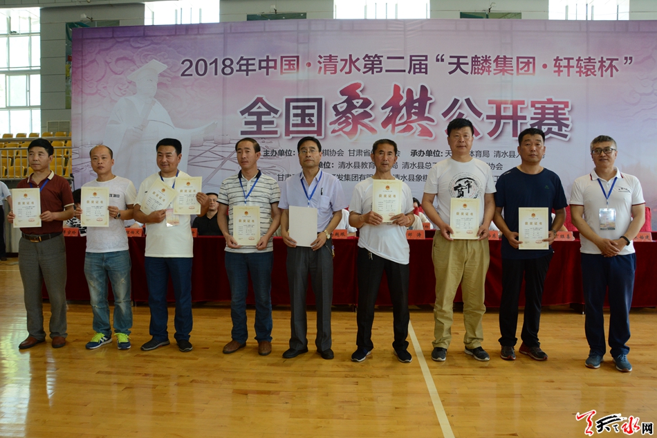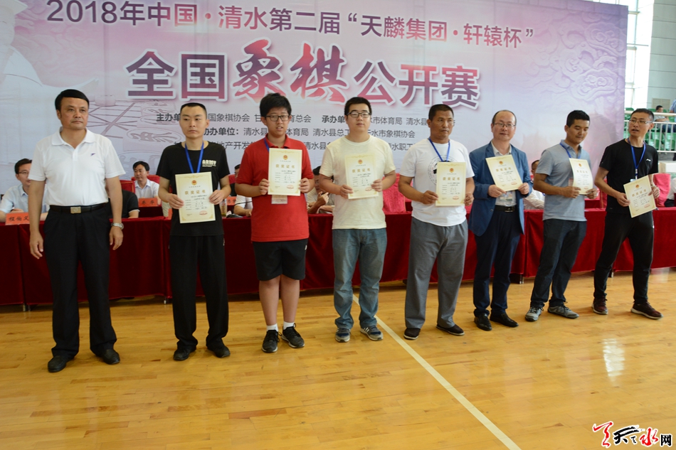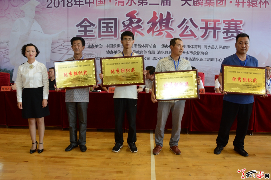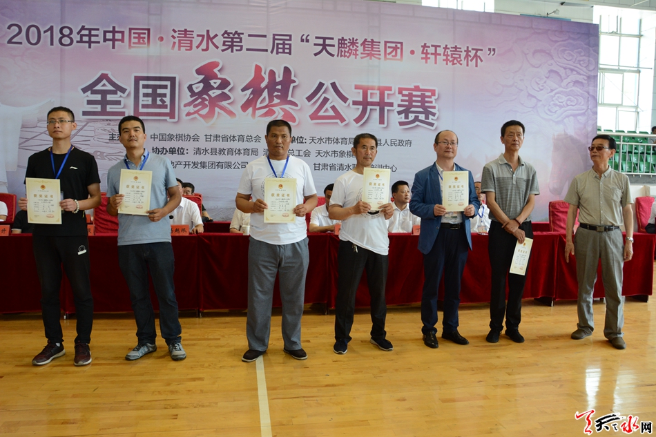 甘肅省體育總會象棋工作委員會負(fù)責(zé)人鄒濤,清水縣人大常委會主任周偉東,縣委副書記、縣長馬越垠,縣政協(xié)主席丁旺喜,縣委常委、副縣長程伯義,甘肅省棋院副院長、天水市象棋協(xié)會主席劉沛毅,定西市象棋協(xié)會名譽(yù)會長朱始建,平?jīng)鍪邢笃鍏f(xié)會主席閆恩升,國家級裁判、本次大賽裁判長劉永進(jìn),國家級裁判、本次大賽編排長李虎,國家級裁判、國家象棋大師馬麟,國家級裁判張娜,天水市象棋協(xié)會秘書長李濤,甘肅天麟房地產(chǎn)開發(fā)集團(tuán)有限公司副總經(jīng)理喬華等出席閉幕式并為獲獎(jiǎng)團(tuán)體和個(gè)人頒獎(jiǎng)。縣政府副縣長李寶玲主持閉幕式??h直有關(guān)單位的負(fù)責(zé)人和全體參賽棋手、仲裁委員會成員、紀(jì)律委員會成員、裁判員和其他工作人員共計(jì)約200多人參加閉幕式。