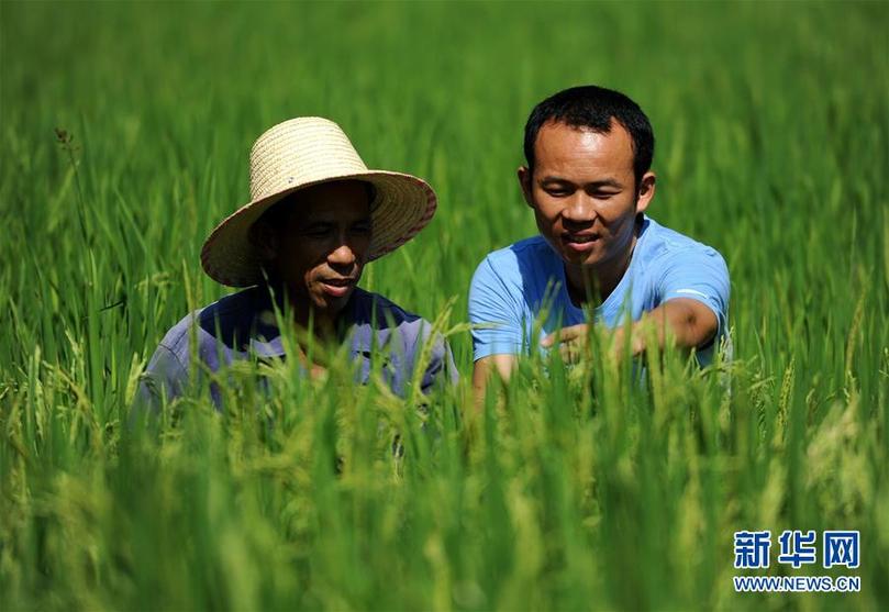 ????在江西永新縣三灣鄉(xiāng)三灣村田西村小組,時(shí)任村支部書記的邢鐳(右)和村民劉小林在交流紫稻生長狀況(2013年8月10日攝)。新華社記者周科 攝