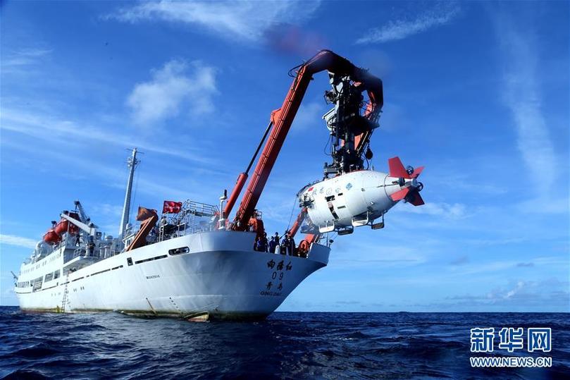 ????“蛟龍”號載人潛水器進(jìn)入水中,進(jìn)行中國大洋38航次最后一潛(2017年6月13日攝)。新華社記者 劉詩平 攝