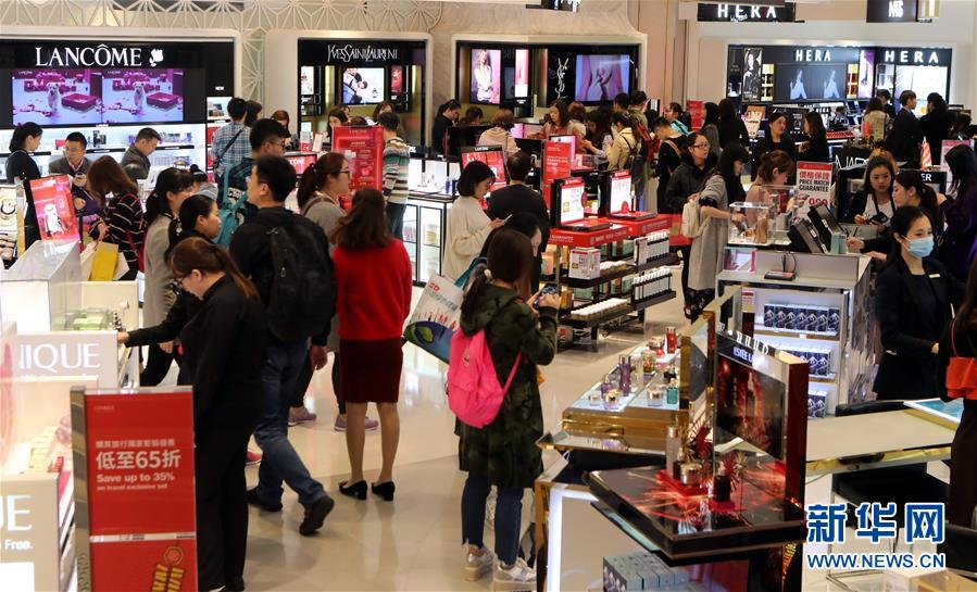 游客在香港銅鑼灣商業(yè)區(qū)一家免稅店購物(2月21日攝)。新華社記者李鵬攝