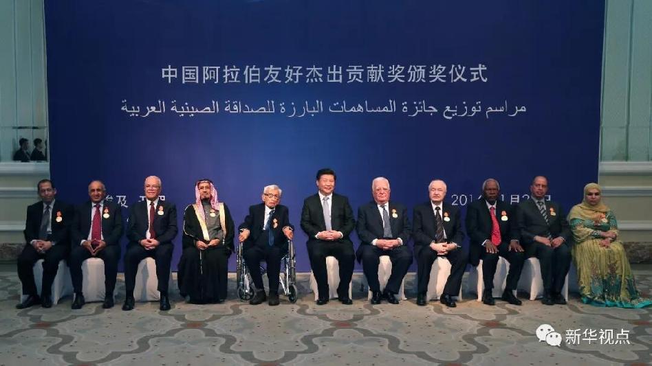 2016年1月20日,國家主席習近平在開羅會見聯(lián)合國前秘書長加利等10名獲得“中國阿拉伯友好杰出貢獻獎”的友好人士并同他們合影留念。新華社記者龐興雷攝