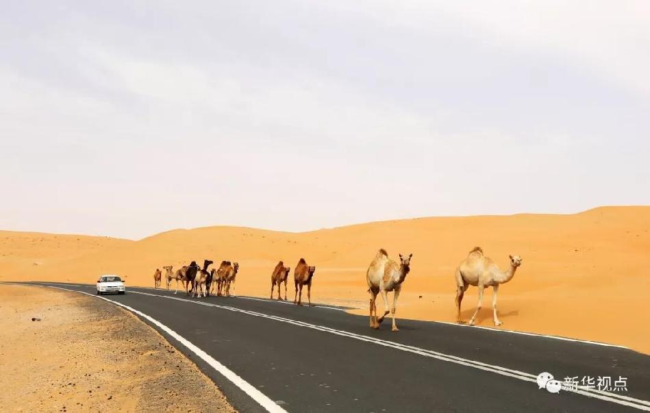 2016年5月6日拍攝的阿聯(lián)酋利瓦沙漠公路上的駝隊。中東地區(qū)連接著東西方文明,有著悠久的歷史文化和美麗的自然風光,是古絲綢之路的重要組成部分。新華社記者李震攝