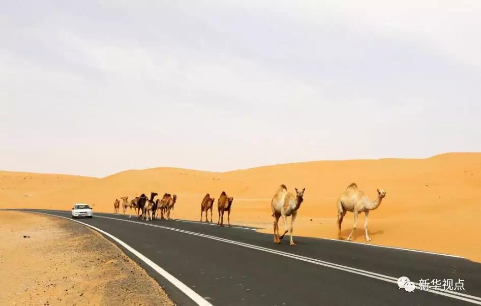 ↑2016年5月6日拍攝的阿聯(lián)酋的利瓦沙漠公路上的駝隊(duì)。 新華社記者 李震攝