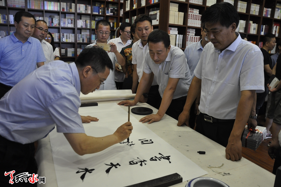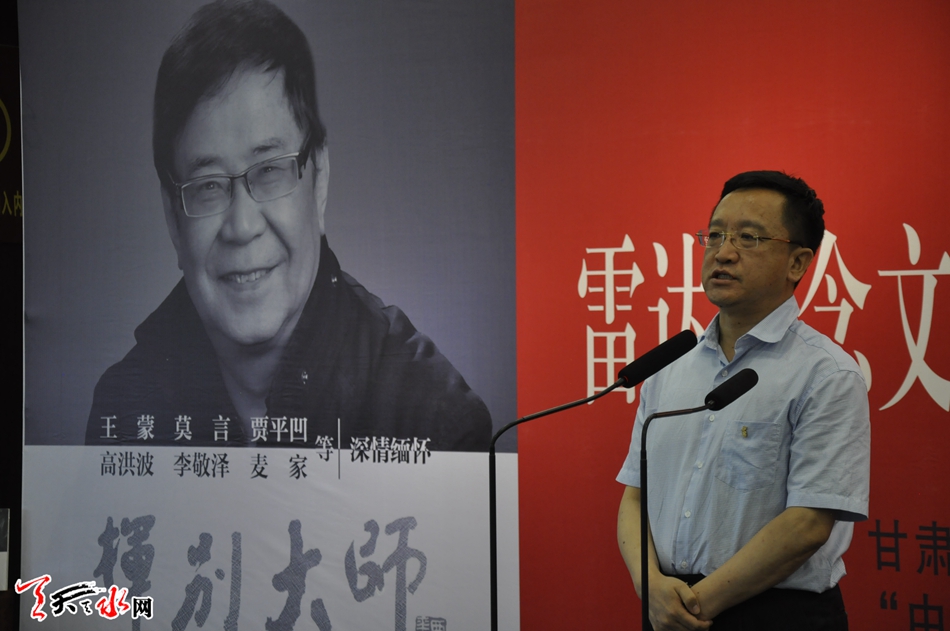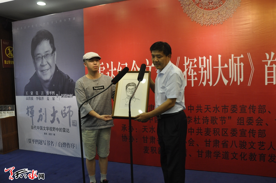 ????在儀式上,受著名作家賈平凹委托,甘肅省文學院院長、甘肅省作家協(xié)會副主席、《揮別大師——當代中國文學視野中的雷達》主編高凱向甘肅漢之韻文化傳媒公司贈送了賈平凹為《揮別大師》題寫的書名題詞。中國作家協(xié)會黨組成員、副主席、著名文學評論家閻晶明先生,甘肅省文聯(lián)主席、黨組書記李燕青共同為 《揮別大師——當代中國文學視野中的雷達》開卷。畫家李川李不川向麥積區(qū)檔案館贈送雷達畫像。