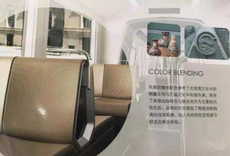車廂的整體配色參考了大地灣文化中的陶罐文化與石窟文化中的和諧色調,采用了典雅的咖啡色與銀灰色作為主要的內飾色彩。座椅的形態(tài)提取了陶器流暢飽滿的線條輪廓,給人良好的視覺觀感與舒適的乘坐體驗。