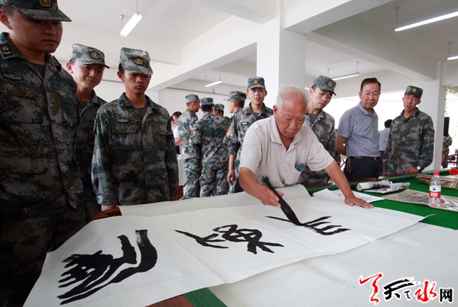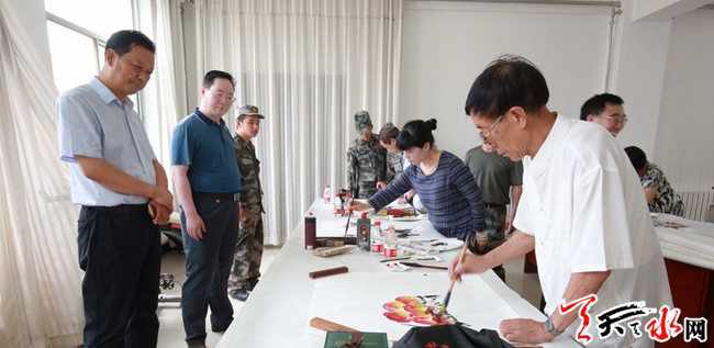 天天天水網(wǎng)訊 在中國人民解放軍建軍91周年即將來臨之際,為豐富武山駐地部隊官兵的文化生活,大力弘揚擁政愛民、軍民團(tuán)結(jié)的優(yōu)良傳統(tǒng)。7月31日,市“兩新”組織工委、社會組織黨委組織我市知名書畫家來到駐武68077部隊,與官兵指戰(zhàn)員們共聚一堂,開展“八一”慰問和書畫進(jìn)軍營活動,為他們送去節(jié)日的祝賀。市委組織部副部長、市非公有制經(jīng)濟(jì)和社會組織工委書記丁曉來出席慰問活動并講話,縣委常委、組織部長高朝峰參加慰問活動。