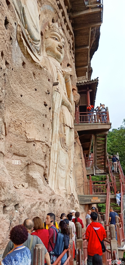 在秋雨霏霏的麥積山石窟,山嵐繚繞、煙雨蒙蒙,麥積奇峰時隱時現(xiàn),呈現(xiàn)出“麥積煙雨”之奇觀。站在造型各異、神態(tài)逼真的雕塑前,采風團成員不由得發(fā)出感嘆。86歲高齡的著名詩歌評論家、第三屆李杜詩歌獎貢獻獎獲得者謝冕雖是第二次來到麥積山石窟,但依然興致勃勃地登上了石窟,認真聽取講解,在塑像前駐足凝視,又一次感受麥積山獨特的藝術之美。