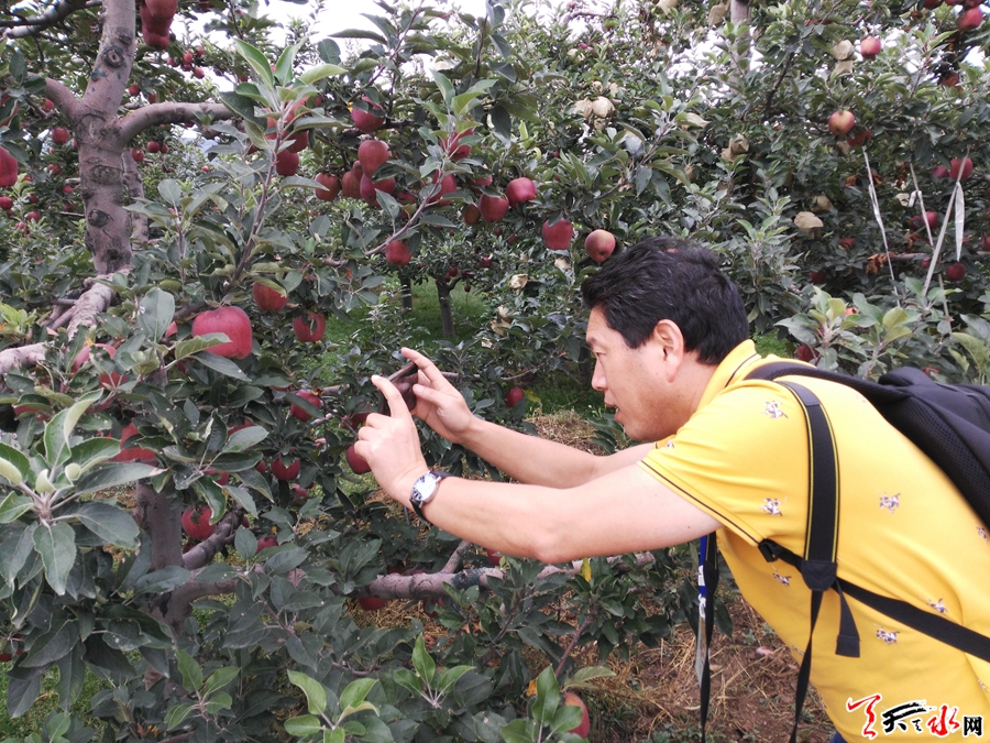 “哇,太誘人了!”當采風團來到果香四溢的南山萬畝優(yōu)質花牛蘋果基地時,看著漫山遍野的蘋果樹和樹梢上紅彤彤的蘋果,紛紛拿出手機、相機狂拍不已,并第一時間用微信、微博等平臺將照片傳送出去,與天南海北的親朋好友分享著此刻激動的心情。
