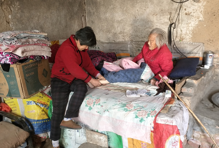 每天,她起床后先幫養(yǎng)母翻身,幫她穿衣洗漱,然后清洗養(yǎng)母換下來的尿布。天氣暖和的時候就跟老伴一起把養(yǎng)母抱到輪椅上推到院子里,曬曬太陽、看看雞鴨鵝,散散心。晚上給養(yǎng)母洗腳、擦身體。為了防止老人得褥瘡,董玉蘭每天還要給她按摩,“俺娘癱瘓這么長時間,腿基本沒有什么知覺了,為了讓她血脈暢通,我會每天給她揉一揉?!?/font>