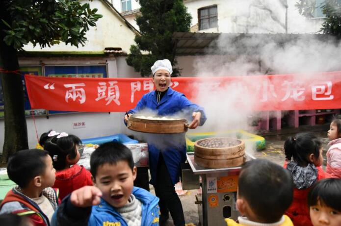 沈紅平(中)上門為民工幼兒園小朋友制作“愛心包子”。圖片來源:浙江文明網(wǎng)