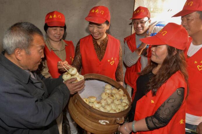 沈紅平(左三)帶領(lǐng)她的“兩頭門”志愿服務(wù)隊(duì)送“愛心包子”給孤寡老人。圖片來源:浙江文明網(wǎng)