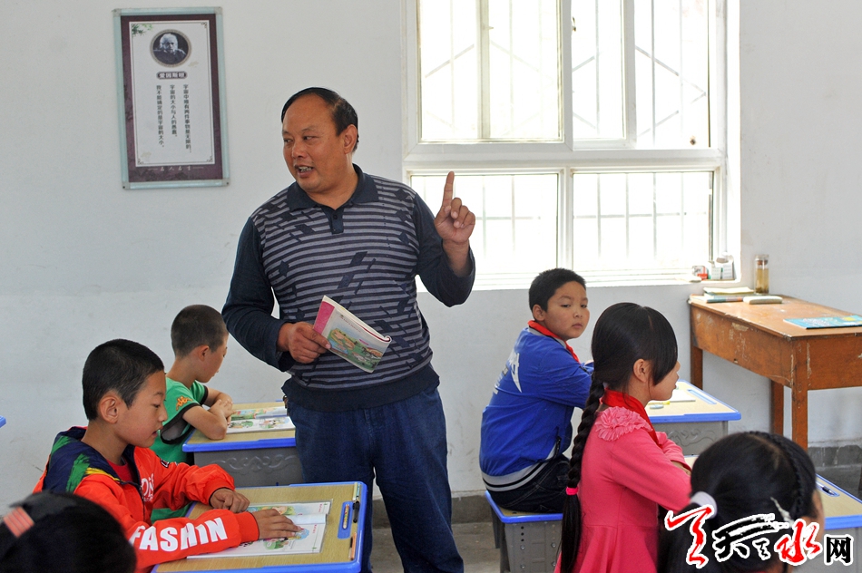 這是麥積區(qū)東岔鎮(zhèn)龍鳳小學(xué)。2018年9月6日上午11時許,記者來到學(xué)校,正值第4節(jié)課,校長李繼承在為四年級的12名學(xué)生上英語。