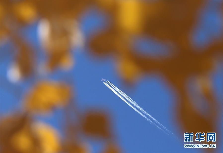 10月6日,一架飛機(jī)從甘肅省敦煌市莫高鎮(zhèn)的胡楊林上空飛過。