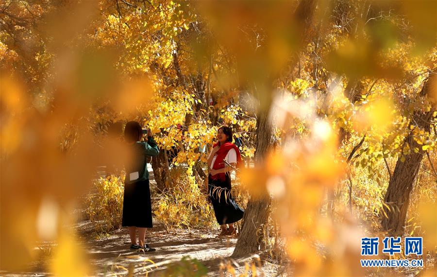 10月6日,游客在甘肅省敦煌市莫高鎮(zhèn)的胡楊林中游玩。新華社發(fā)(張曉亮 攝)