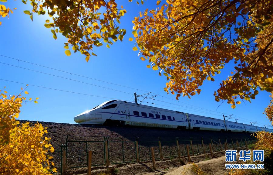 10月6日,一列動車從甘肅省敦煌市莫高鎮(zhèn)的胡楊林旁駛過。新華社發(fā)(張曉亮 攝)