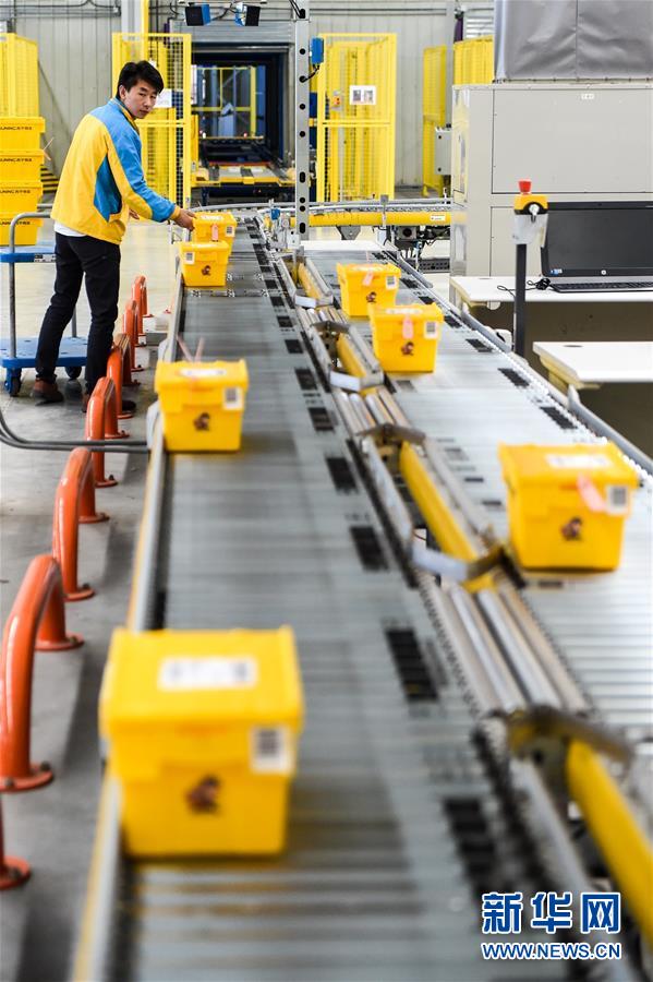 在江蘇南京蘇寧云倉物流基地,工作人員將包裝好的“共享快遞盒”放到傳送帶上,準備進行分揀運輸(2017年10月31日攝)。新華社記者 李博 攝