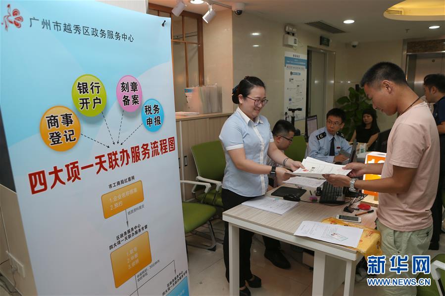 7月19日,“四大項一天聯(lián)辦服務專窗”在廣州市越秀區(qū)政務服務中心亮相,工作人員將營業(yè)執(zhí)照遞交給申請者。 新華社記者 張加揚 攝