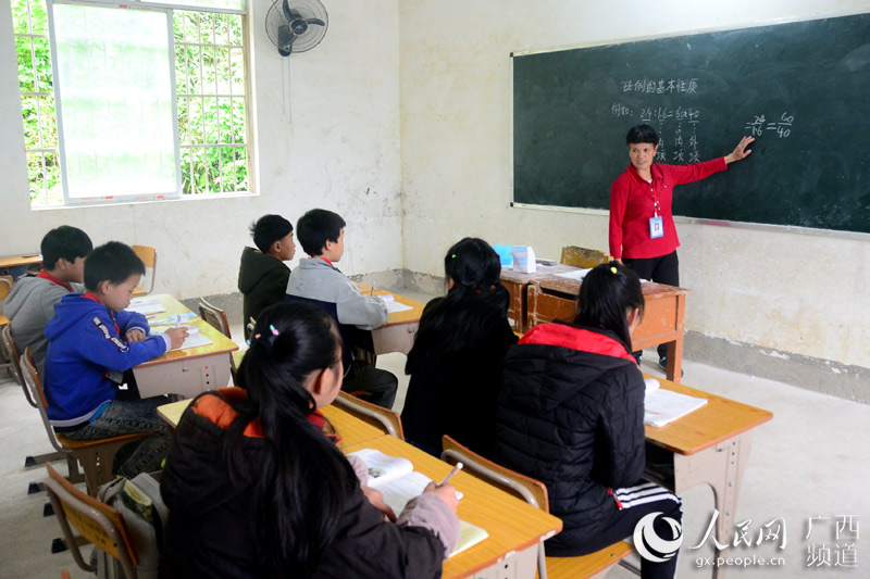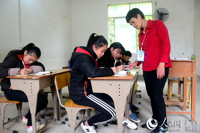 李水英(右一)指導(dǎo)學(xué)生做作業(yè)。圖片來源:人民網(wǎng)廣西頻道